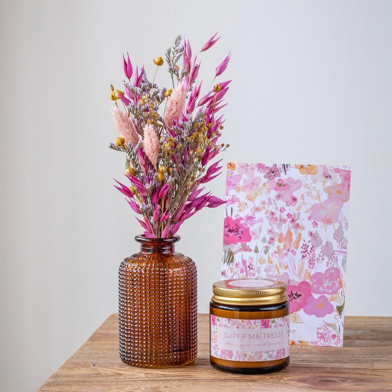 Nuestro equipo ha mostrado creatividad al ofrecer una caja de regalo original de Mistress. Está compuesto por una vela perfumada con monoi con una hermosa etiqueta de agradecimiento, un ramo de rosa en flores secas en su jarrón en vidrio ámbar y una bonita tarjeta florida.