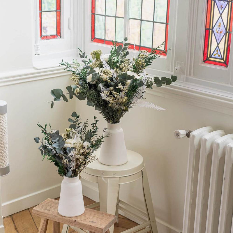 Ramo de flores secas Lucien : Una mezcla armoniosa de rosas Phalaris, Lagurus, Eucalipto y Ruscus te trae un buen toque de color y elegancia. Es perfecto para decorar un espacio en un estilo rural. Este ramo de flores secas dura meses si está bien mantenido.